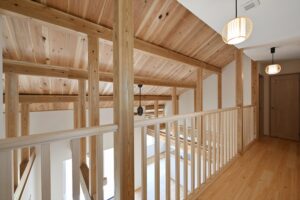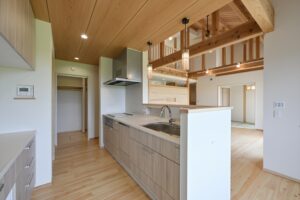 勾配天井が空気の流れを生み、冷暖房効率も高めてくれます。梁を見せるデザインは構造の美しさを感じさせ、